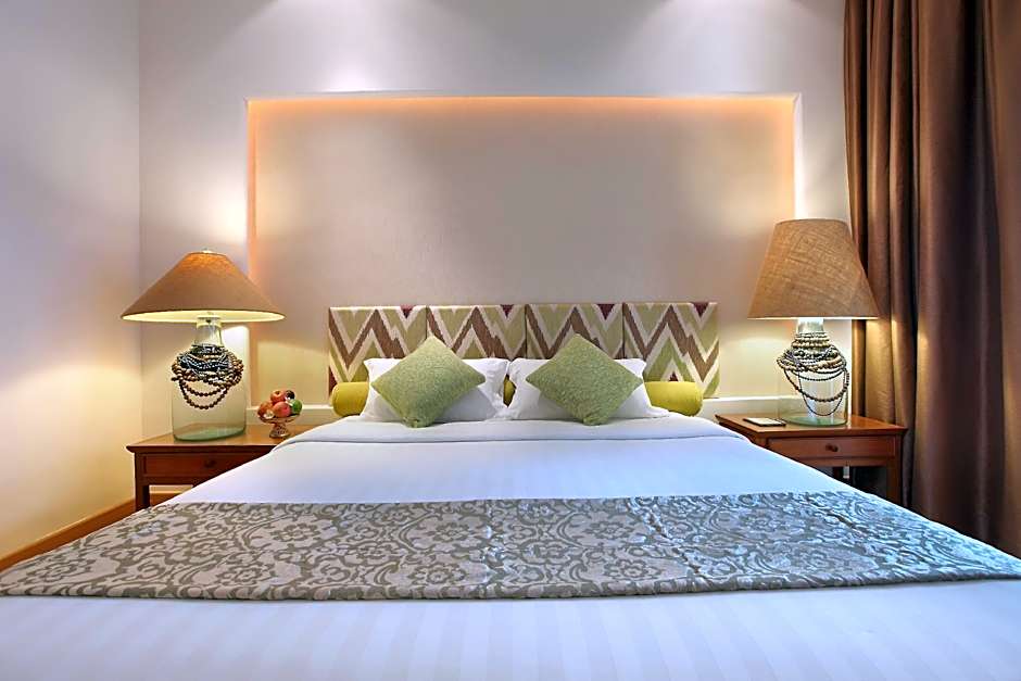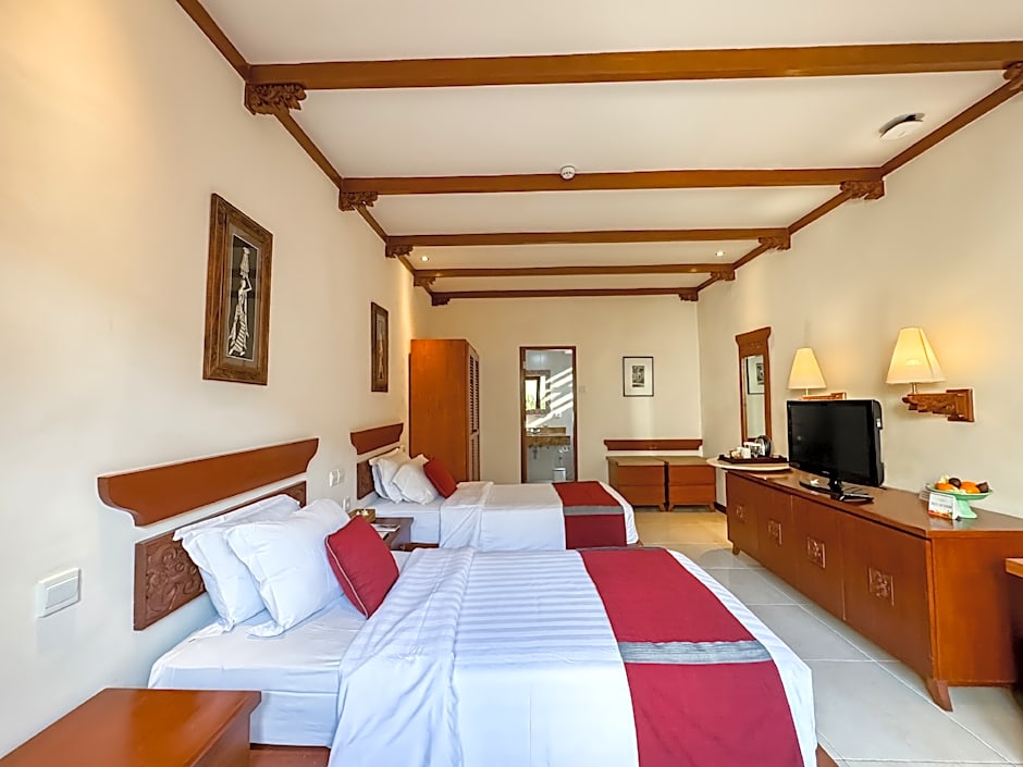 DELUXE COTTAGE is 344 square feet and includes either a double bed 131-150 width or 2 single beds 80-130 width plus terrace, cable tv, hairdryer, tea and coffee making facilities , ironing set, safe, and slippers.